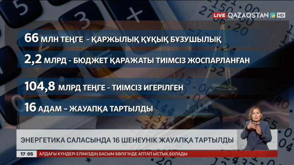 Энергетика саласында жүргізілген аудиттің қорытындысы шықты. Осының негізінде 16 шенеунік жауапқа тартылды. Себебі 66 млн теңге қаржылық құқық бұзушылық тіркелді. 2 млрд теңгеден аса бюджет қаражаты тиімсіз жоспарланғанған. Ал 104 млрд теңге тиімсіз игерілген. Сондықтан Энергетика министрлігінің Департамент директорынан бастап, электр энергиясы саласындағы лауазымды тұлғалар жауапқа тартылып жатыр.