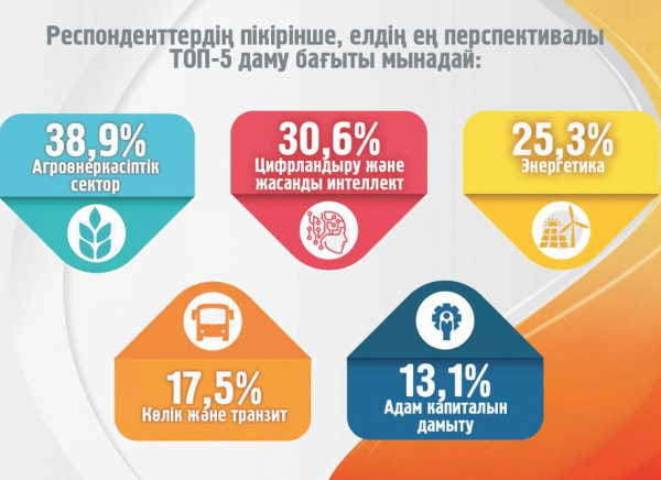 Ел болашағына қатысты респонденттердің көпшілігі еліміздің өңірлік қана емес, жаһандық деңгейде де көшбасшы бола алатын салаларын атап өткен. Мәселен, агроөнеркәсіптік сектор, цифрландыру және жасанды интеллект, энергетика, көлік және транзит, адам капиталды дамыту – ең перспективалы бағыт.