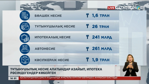 Несиенің қай түріне сұраныс артты? Қазақстанда шілде айында бөлшек кредит беру көлемі 1,6 трлн теңгеге жетті. Кепілсіз тұтынушылық несие маусым айымен салыстырғанда 2 пайызға төмендеген. 26 трлн млрд теңге. Ал ипотека беру көлемі керісінше 13,4 пайызға артқан. 12 мың 500 адам 241 млрд теңге көлемінде қарыз алған. Автонесиеге де сұраныс артып жатыр. Шілдеде 26 мыңға жуық адам 261 млрд теңге көлемінде автонесие алған. Сонымен қатар кəсіпорындарға 1,9 трлн теңге кредит берілген. Бірақ бұл көрсеткіш қаңтармен салыстырғанда 3 пайызға төмендеген.